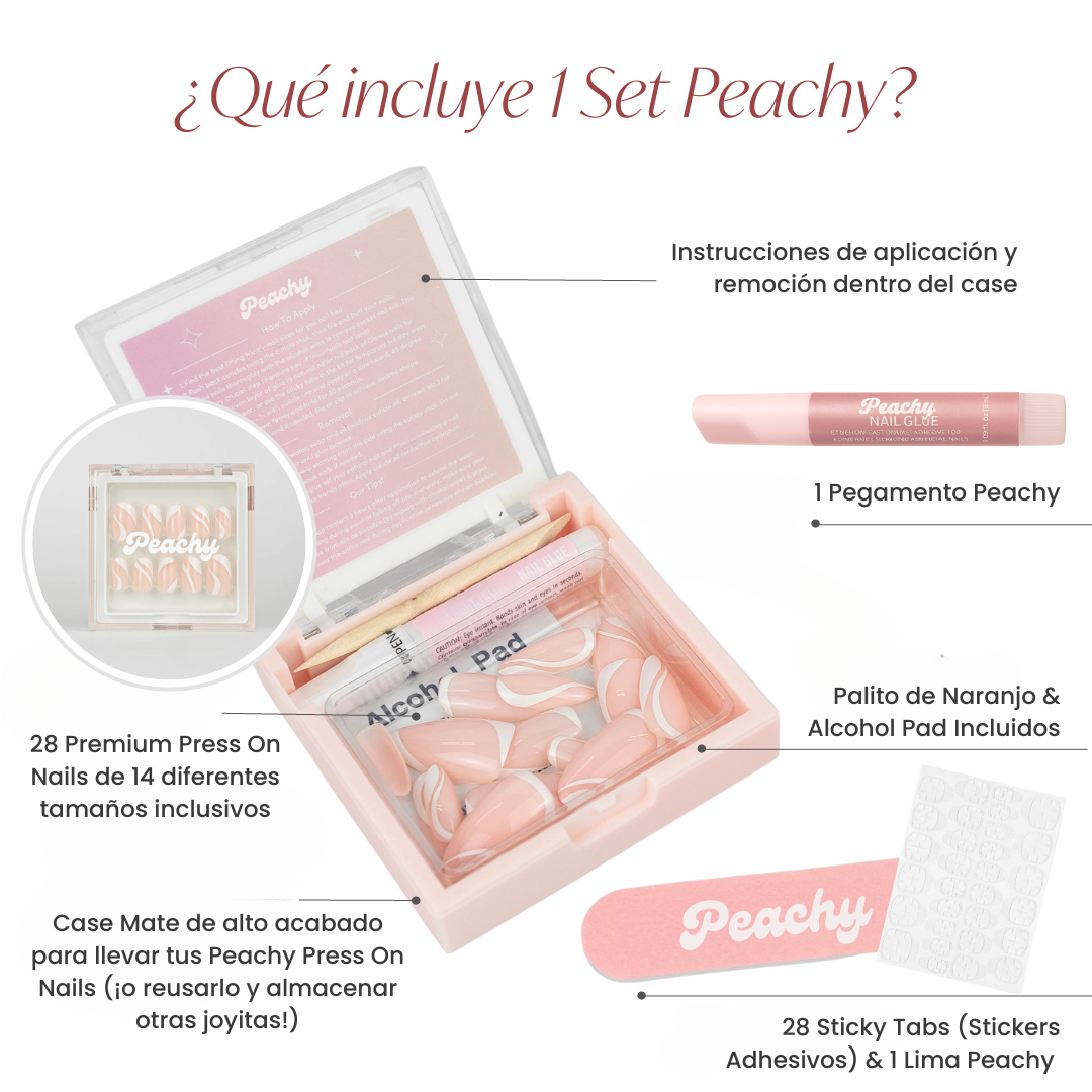 Aplica el pegamento Peachy después de elegir el tamaño ideal para tu uña natural. No te preocupes por la talla: cada set incluye 28 uñas con todas las medidas necesarias.